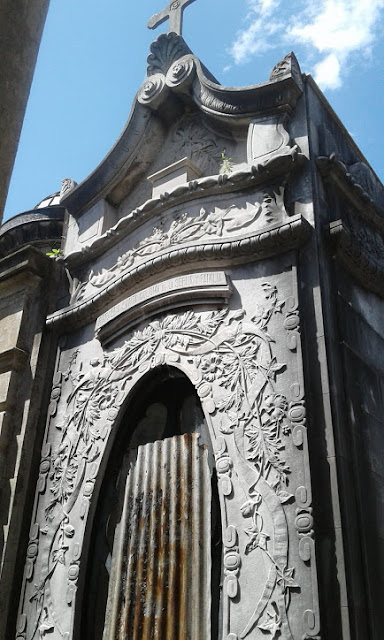 Este fué mi primer encuentro con el Art Nouveau en este cementerio para mi gran sorpresa ya que sus lineas decorativas que se imponen a la misma arquitectura me parecia que expresaba un sentimiento un tanto contrapuesto con el contexto. Sus lineas semejantes a un sinuso látigo son expresión de una confianza en el progreso indefinido con una invitación muy directa a gozar de la vida. Posiblemente muchos de estos sentimientos fueron los que motivaron la elección de este estilo para la decoración de esta bóveda, gloriosa en otros tiempos. Todo expresa una gran serenidad, totalmente despojada de cualquier manifestación de duelo o pena y nos propone con flores, plantas y curvas mirar la vida con optimismo y que la muerte no interrumpa ese sentimiento. La cantidad de obras arquitectónicas Art Nouveau en este Cementerio es muy posible un elemento que hace a su identidad ya que son numerosas las obras que siguen estas líneas decorativas.